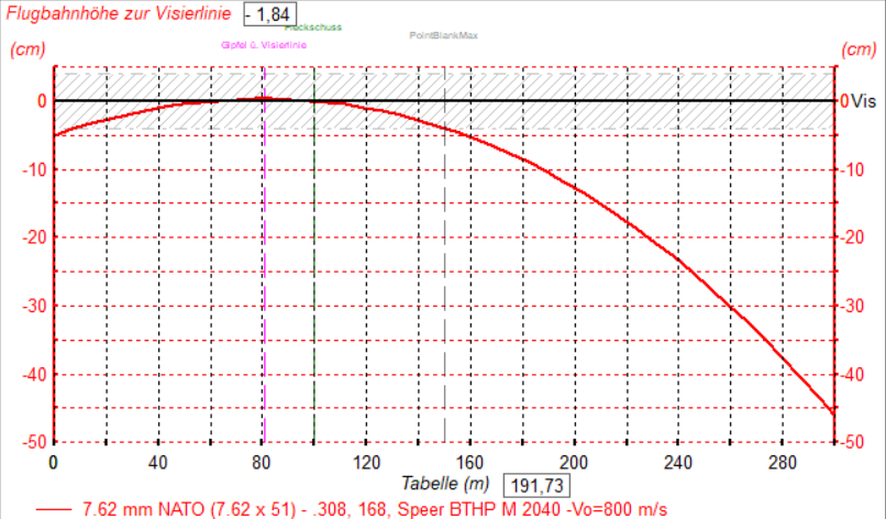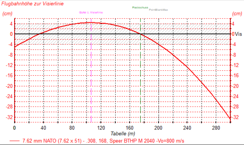 Ergebnis: Typische Flugbahn einer .308 Win bis 300 m
